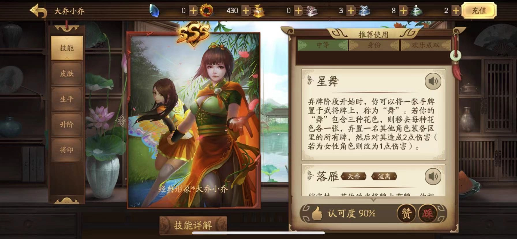 关于她的第二个技能“落雁”,这是个锁定技——当玩家持有“星舞”牌时,就等同于同时拥有“天香”和“流离”两个技能。简单来说,“落雁”相当于“天香”与“流离”的中转桥梁:其中“流离”是对大乔同名技能的完美复刻,“天香”也最大程度还原了小乔的原版效果。一个武将能同时兼具两到三个其他武将的技能,单是想想就知道有多强势了。