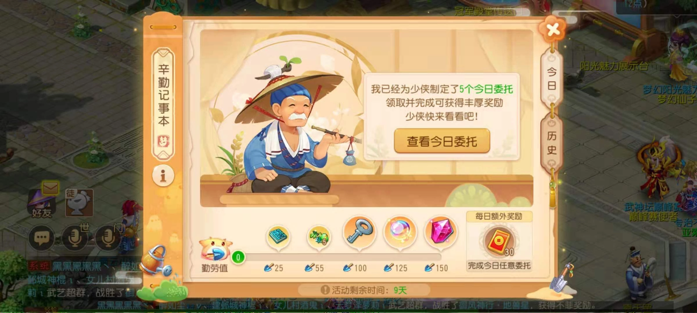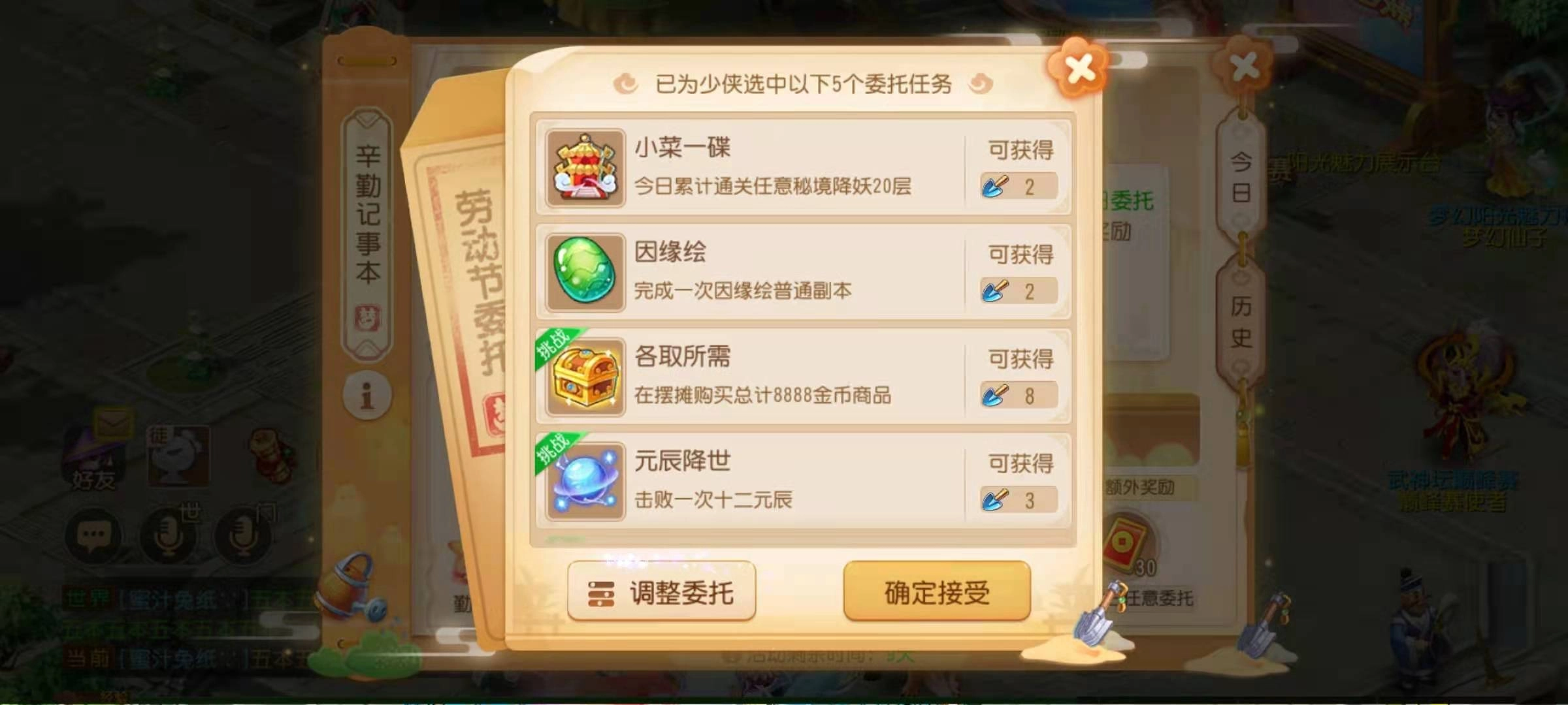 玩家可前往长安城台子处,找到劳动之星(即劳动节活动大使)参与领取辛勤记事本的活动。该活动大使每日会为玩家准备5个委托任务,玩家完成相应委托任务即可获取勤劳值,当勤劳值累积到足够数量时,就能兑换对应的奖励。每日玩家需要从委托任务中选择2个普通委托和3个挑战委托。需要注意的是,各类委托任务的数量均有上限,玩家一旦领取委托任务,系统便会扣除该委托任务对应的次数。此外,委托任务会在每天晚上12点进行重置,因此玩家需在当天内完成已领取的委托任务。