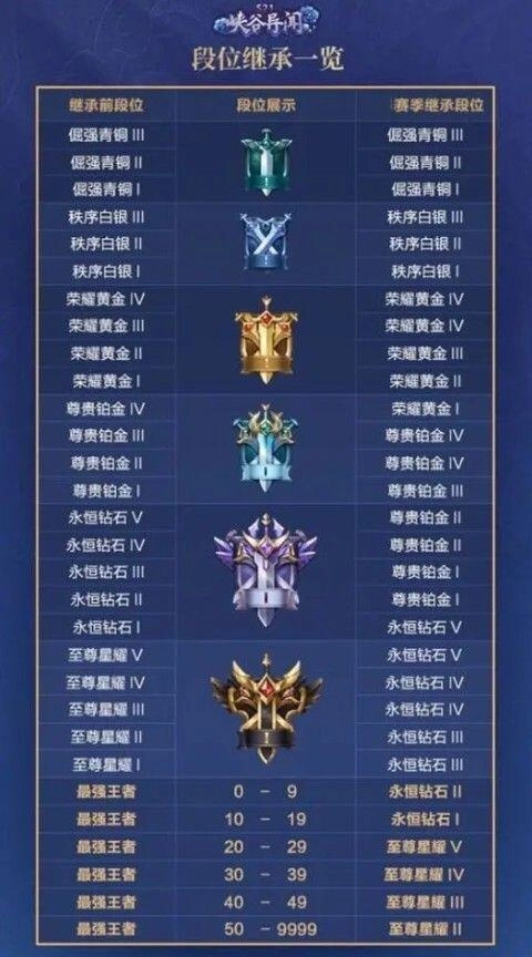 这次的段位继承规则和以往相同,白银及以下段位保持不变,段位越高继承后的变化幅度越大。特别是最强王者段位,每高出10颗星,继承时就能少掉一个段位;而50星以上的王者玩家,统一继承至星耀2段位。这意味着无论玩家在上赛季多么顶尖,赛季初的初始段位最高也只能是星耀2,因此赛季初的排位赛竞争会异常激烈,实力稍弱的玩家不妨考虑过几天再参与排位。