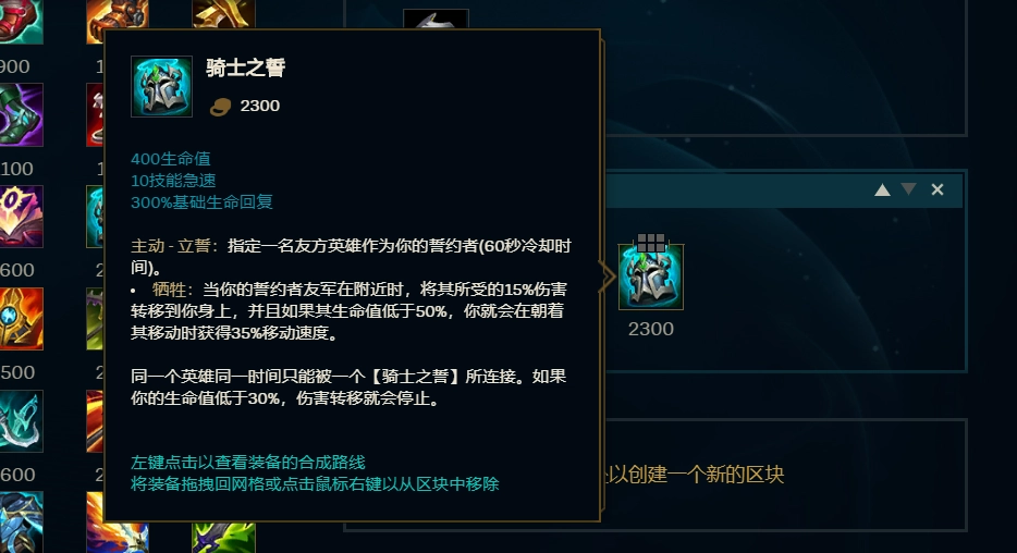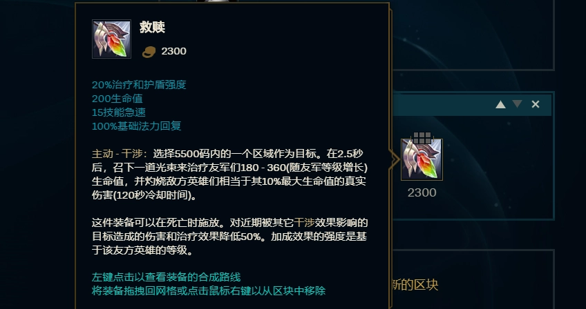 接下来要出的还是辅助装备,我们选【救赎】。毕竟锤石本身没有加血技能,而且他的E和R技能都是范围性伤害/效果,在团战里能发挥不小作用,搭配救赎的群体治疗效果,能给团队带来不错的团战增益。