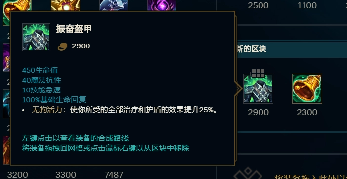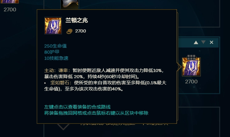最后一件装备我们可以选【兰顿之兆】,它能增加护甲;不过要是敌方的AP伤害比较多,我们就可以换成绿甲【振奋铠甲】。