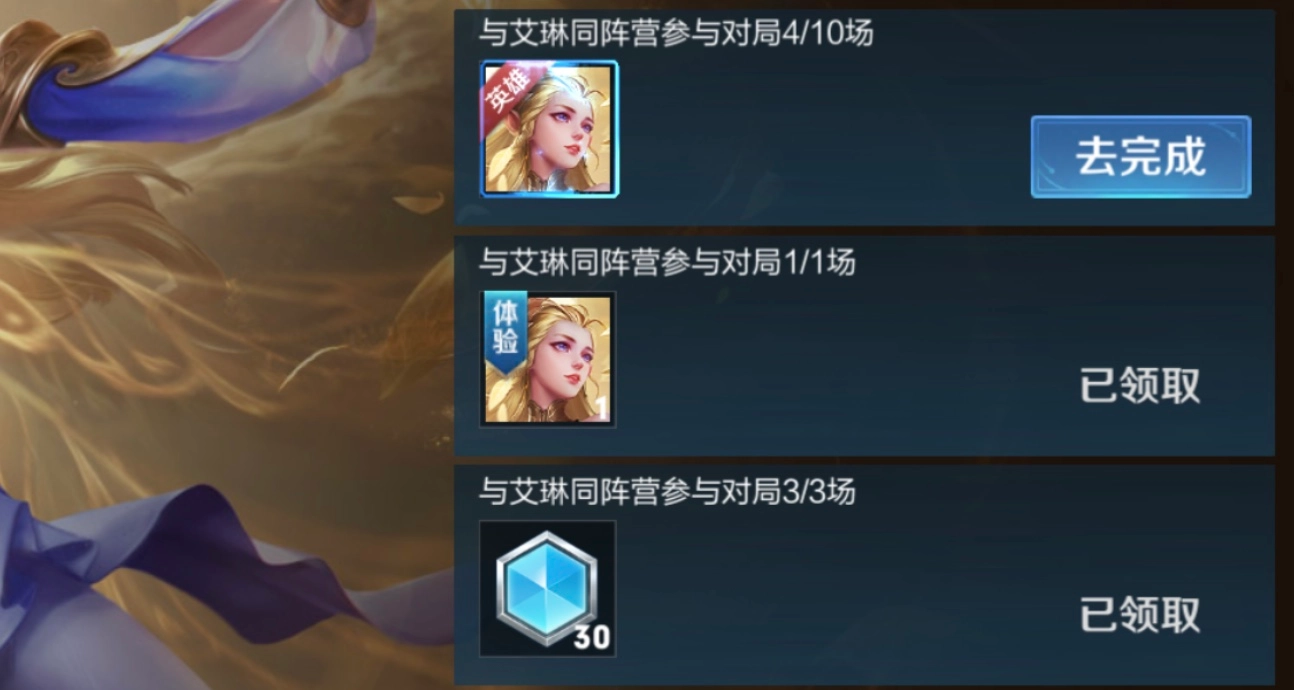 2. 适合人群:该获取途径对游戏时长和任务时间充裕的召唤师较为友好,仅需完成10局游戏对战(无论胜负)即可领取艾琳,堪称零成本——无需消耗金币与钻石,获取难度处于最低水平。