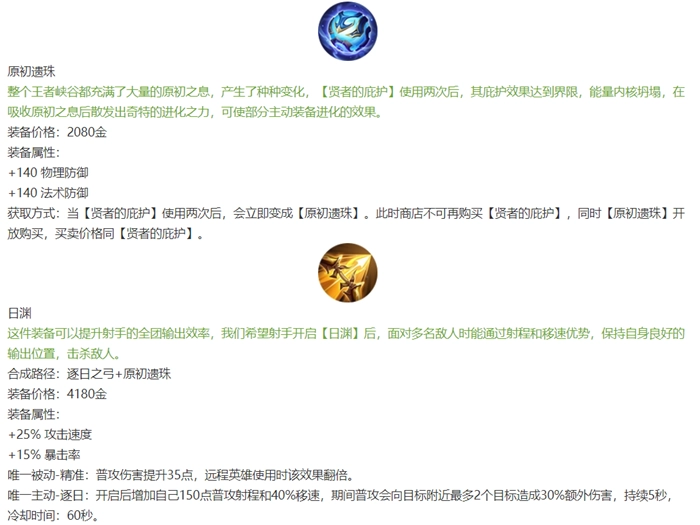 2、其他5件新装备:日渊、天穹、月神、怒魂、凛冬这五件装备,均由原初遗珠与另一件指定装备合成。具体来看,日渊的合成需要逐日之弓搭配原初遗珠,天穹需纯净苍穹加原初遗珠,月神要辉月与原初遗珠组合,怒魂由血魔之怒和原初遗珠合成,凛冬则需冰霜冲击加上原初遗珠。