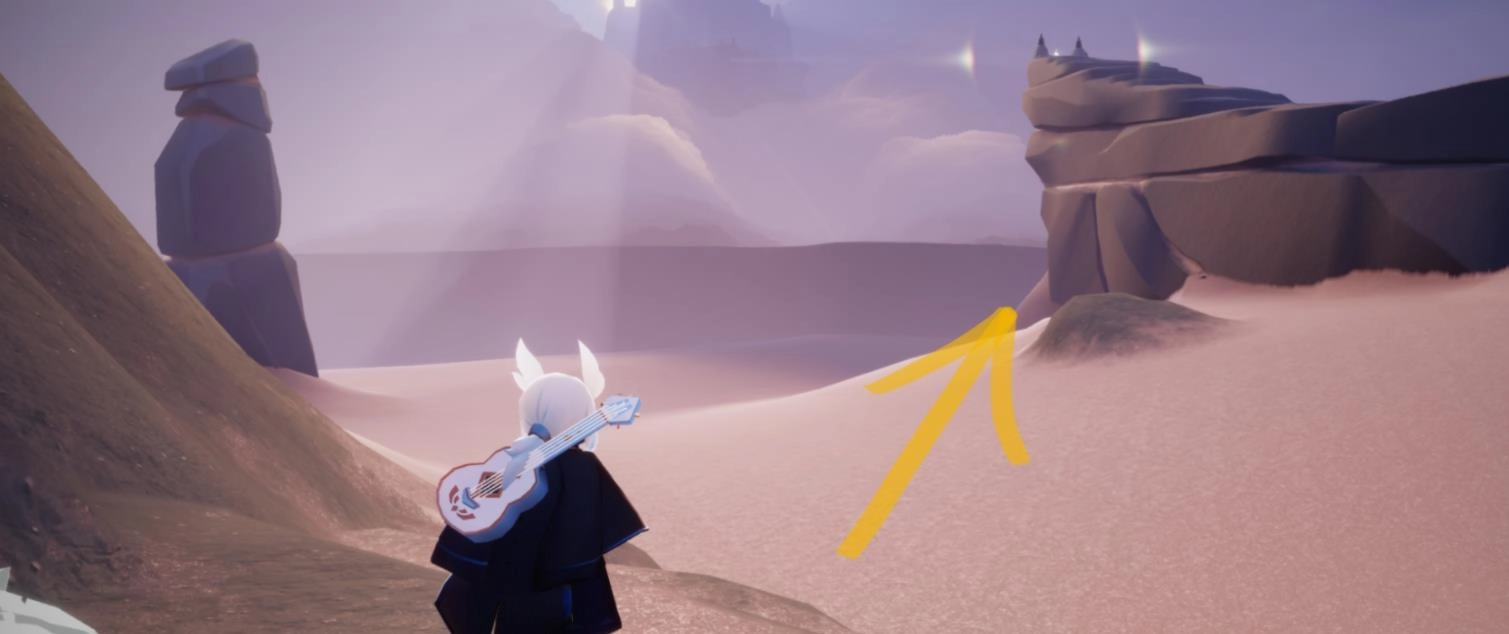 穿过山洞,踏上这个土台后,往左侧前方继续走,接着在下图标注的位置,就能看到第一个身影了,他就在沙坡的山洞外面呢。