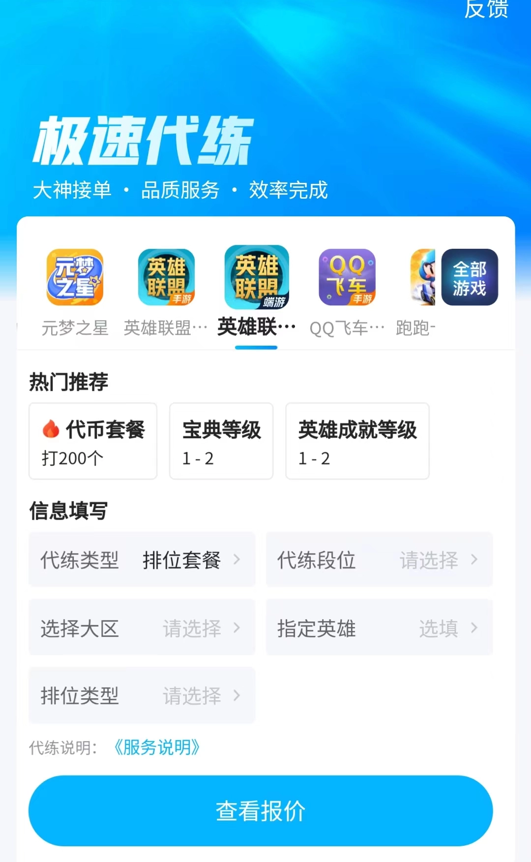 最后,平台还设有极速代练功能。对于缺乏时间的玩家而言,只需挑选对应的排位套装,提交自己期望达到的段位,就能找到实力较强的代练,助力玩家的账号提升段位。