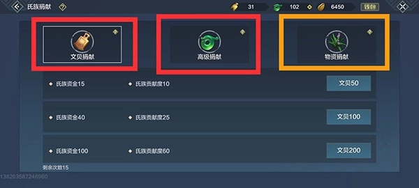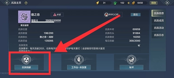 接着能看到捐献分为文贝捐献、高级捐献、物质捐献这三种。当氏族拥有大量木头和石头后,就无需再捐献它们,此时可选择文贝捐献或高级捐献。