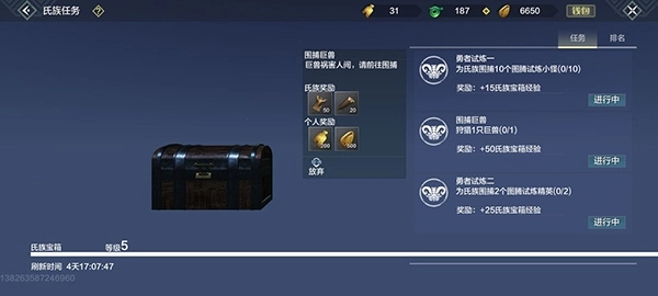 点击氏族任务,每日自行接取氏族任务,注意需每日主动接取,完成后可获得400贡献度。