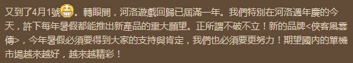 在这个回归周年庆的时刻,被称为“河洛三部曲”(即《武林群侠传》《金庸群侠传》《三国群侠传》)之父的知名游戏制作人徐昌隆先生,通过微博发布了新游戏《侠客风云传》的一组图片,同时许下了每年暑假都能推出新产品的美好期许。