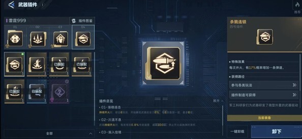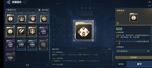 插件1号位建议选【渐入连击】,它能显著减小999的后坐力,让输出更稳定;官方推荐的大弹夹则没必要选,因为它一点子弹都不加——这把武器的被动本身就把子弹上限设为999发了,所以弹夹加长的效果对它没用。