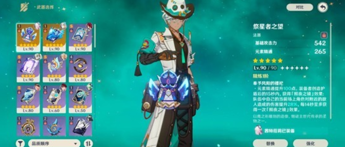 4星武器方面,可选择晚星,它能提供精通加成,同时为全队带来攻击收益;也可以选用祭礼系列武器,其不仅能提供精通加成,还具备重置元素战技冷却时间的效果。