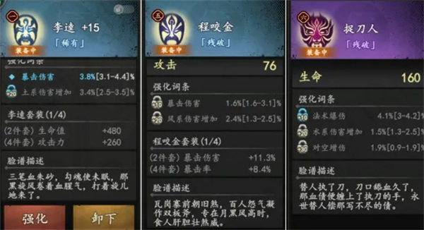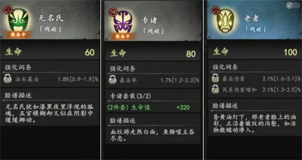 每个品级内部,会根据词条的属性数值来划分颜色品质,从低到高依次是白色、蓝色、紫色、橙色。对应这些词条颜色,脸谱会标注残破、普通、稀有、珍贵、绝世这五个梯度的后缀,但这个后缀仅作参考,词条选择还是要依据具体属性来定——要是遇到重要属性,哪怕是残破后缀,也可能比绝世后缀更有价值。