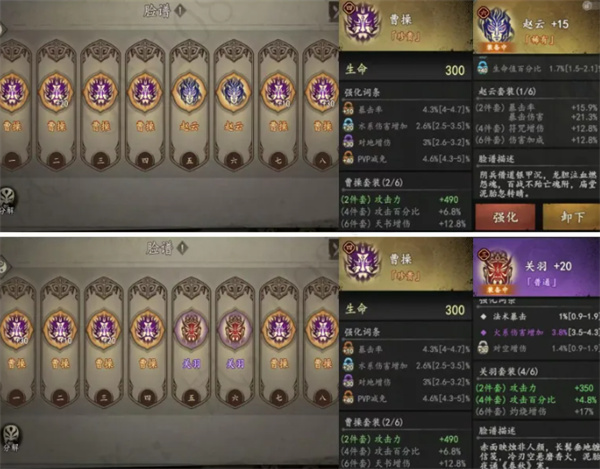 2、2.6 曹操搭配赵云:这套组合是毕业套装之一,上限相对更高,不过核心条件是赵云的第4词条必须是攻击力百分比,因此获取难度比较大。