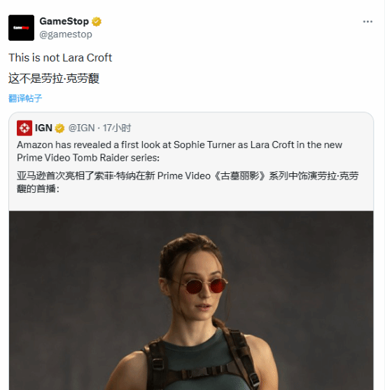关于劳拉真人剧的选角争议,连全球最大游戏零售商GameStop都忍不住下场发声,其官方推特直接表示:这完全不是大家所熟悉的劳拉形象。