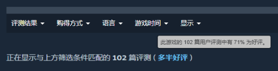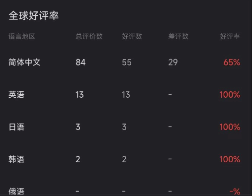 目前已有的102条评测里,好评率达71%。其中简中地区的评测数量最多,共有84条,不过好评率只有65%。而其他语言的评测尽管样本量相对较少,但好评率都是100%。