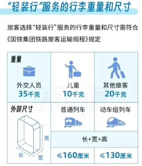 “轻装行”服务的行李重量与尺寸要遵守《国铁集团铁路旅客运输规程》的规定:儿童旅客每人可携带10公斤行李,外交人员每人可携带35公斤,其他旅客每人可携带20公斤;普速列车上的单件行李,其长宽高之和不能超过160厘米,动车组列车上的单件行李,长宽高之和则不能超过130厘米。此外,还需符合国家铁路局和公安部发布的《铁路旅客禁止、限制携带和托运物品目录》的相关要求。