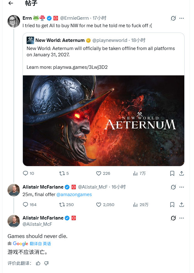 不过事情迎来了转机。英国游戏开发商Facepunch(旗下作品包括《腐蚀(Rust)》与《Garry's Mod》)的CEO兼公司董事Alistair McFarlane,在X平台上发布了一则“报价”信息,表示愿以2500万美元的价格从亚马逊手中收购这款游戏,还补充道“游戏不该就此消亡”。