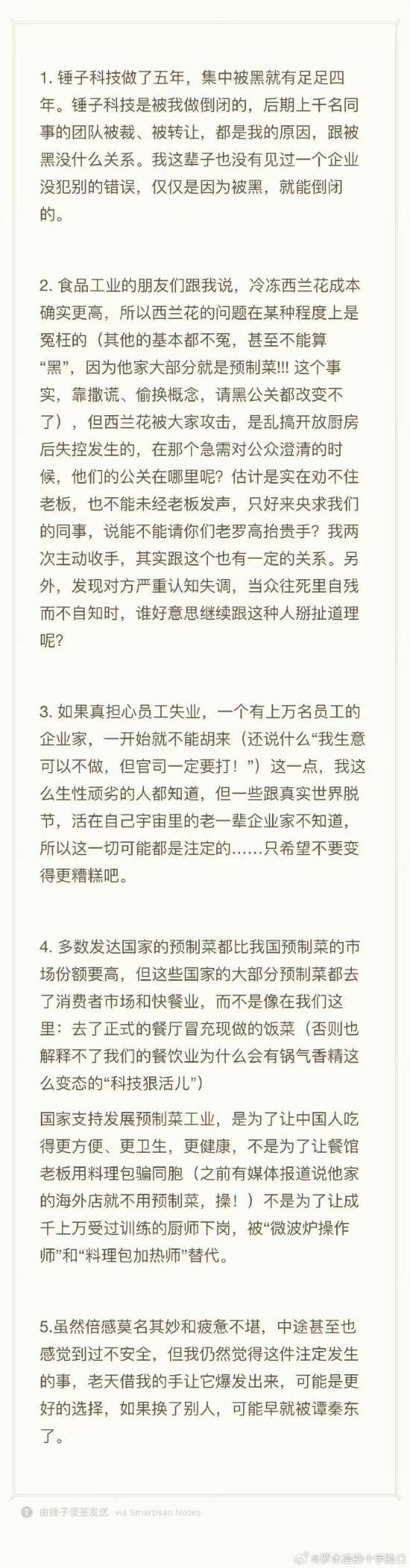 1月16日,@罗永浩的十字路口 通过长文回应表示:锤子科技在五年的经营过程中,有四年时间都处于被抹黑的状态。不过需要明确的是,锤子科技是我把它做倒闭的,后期团队上千名同事被裁员、被转让,这些情况的责任都在我,和被黑没有任何关系。而且我这辈子也没见过哪家企业不犯其他错误,仅仅因为被黑就倒闭的。