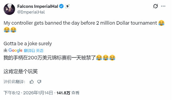ImperialHal在社交媒体上发文表示:“距离一场奖金高达200万美元的比赛仅剩一天时,我的手柄却被封禁了。这绝对是在开玩笑吧。”