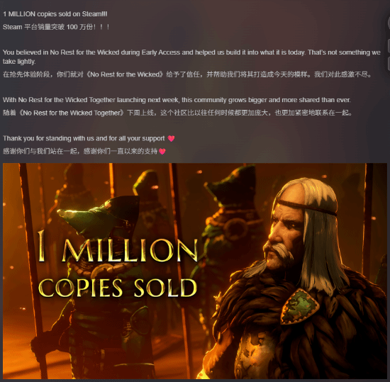 近日官方宣布,该作在Steam平台的销量已突破100万份!同时官方还预告,本作的多人合作模式将于下周正式推出。