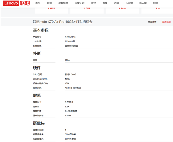这款新机现已在联想商城启动预约,共有12GB+256GB、16GB+512GB、16GB+1TB三种存储规格可选,配色方面则提供墨岚黑与梧桐金两款选择。