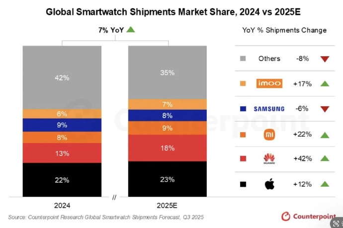 根据Counterpoint的数据显示,2025年全球智能手表出货量反弹增长7%,中国市场功不可没,占有率从25%冲到31%,稳居全球第一。