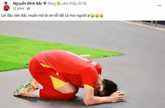 和赛前欢乐的氛围不同,赛后越南队的队员们,像球队的头号球星阮庭北以及主帅金相植,都在社交媒体上发文向球迷致歉。其中阮庭北还晒出了自己抱头跪地的照片,配文写道:“首先我想说的是:对不起大家!”
