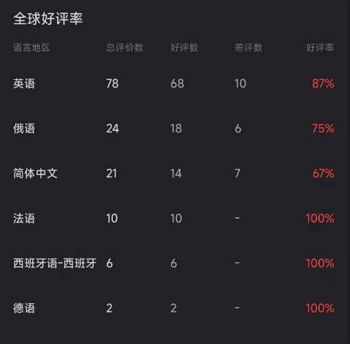 在目前已有的152条评测反馈里,好评占比达到了84%的较高水平。从各地区分布来看,英语地区的评测数量最多,共有78条,其中好评率为87%;俄语地区次之,总计24条评测,好评率是75%;简体中文地区的评测数量相对少一些,有21条,好评率则为67%。