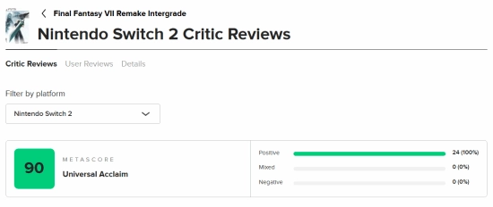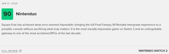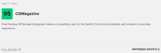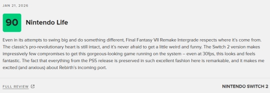 《最终幻想7:重制版Intergrade》即将在本周四登陆任天堂Switch 2与Xbox Series X|S平台。现阶段NS2版本的媒体评测已正式公布,M站汇总了24家媒体的评价,平均得分90分,且收获了全好评的佳绩!