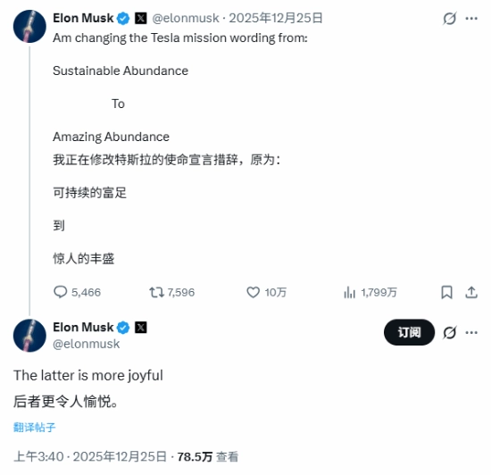 去年12月,马斯克在X平台发文表示,打算对特斯拉的使命表述进行调整,将“可持续的富足”更改为“惊人的富足”,他还解释道,新的说法更能带来愉悦感。