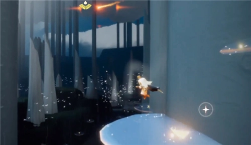 1、在雨林终点图的龙骨残骸附近上空,有一道橙色光芒,它曾是魔法季的火之灵。当我们抵达目的地后,这道橙色光芒会从高空缓缓降落,我们需要耐心等待一分钟左右。