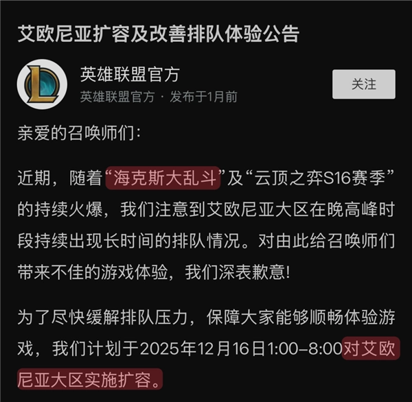 直到上个月,官方决定给一区扩容服务器,排队情况才得到缓解。