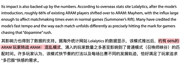 外服在 15.21 版本上线海克斯大乱斗后,极地大乱斗玩家暴跌了 66%。
