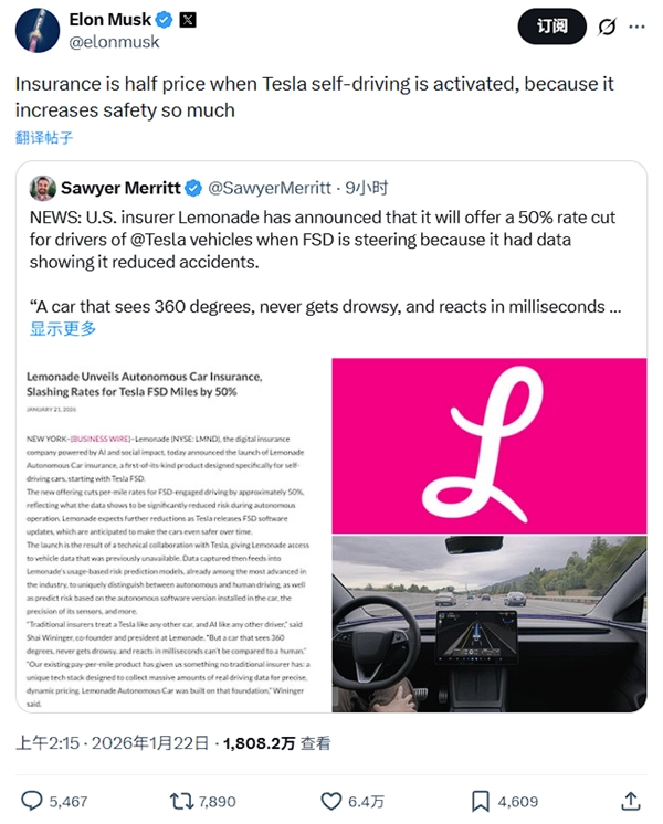 针对此事,马斯克在X平台上回应称:“特斯拉的自动驾驶功能一旦开启,保险费用就会降低一半,这是由于该功能显著增强了车辆的安全性。”