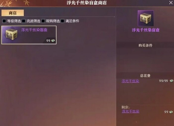 1、玩家需先参与各类活动以获取【浮光千丝染】,之后开启【浮光千丝染盲盒商店】。