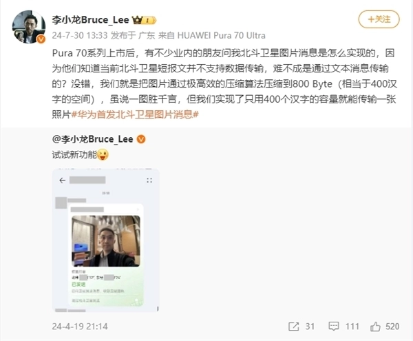 值得一提的是,华为于2024年推出的Pura 70系列,在行业内率先独家达成了北斗卫星图片消息功能的实现,该系列机型不仅可以支持文字与地理位置信息的发送,还具备图片信息的发送能力。