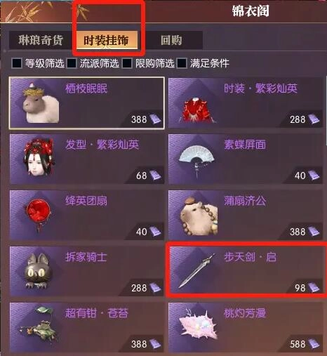 2、接下来,打开【锦衣阁 - 时装挂饰商店】,从中找到【步天剑•启】。