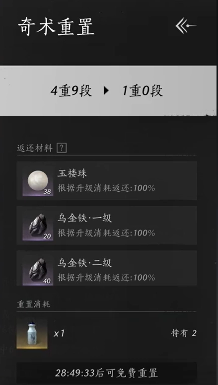 3、重置时会自动添加奇术重置丹,此时直接点击重置即可。