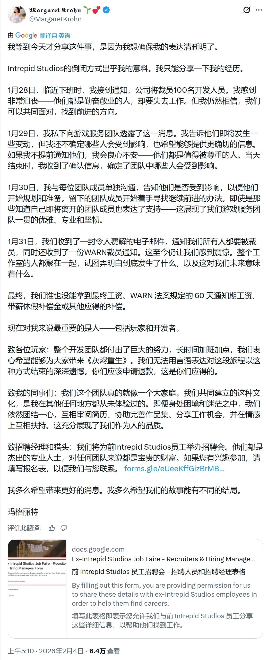 危机的序幕由Intrepid Studios多位员工在LinkedIn发布求职信息拉开。前通讯总监玛格丽特·克罗恩证实:“所有人都被解雇了,情况令人痛心。”紧接着,公司创始人、《创世灰烬》创意总监史蒂文·谢里夫在游戏社区发表声明,透露公司控制权已脱离其掌控,董事会推行了他“在道德层面无法认同或执行”的举措,故而他以辞职表达抗议。他的离职引发核心领导团队集体离开,董事会随后决定依照《WARN法案》实施大规模裁员。