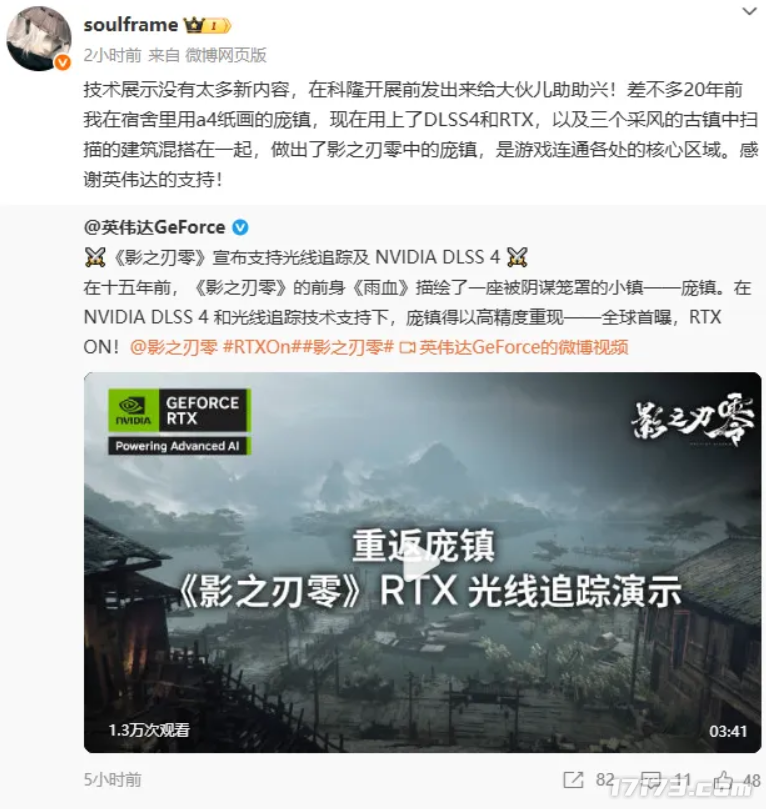 以《影之刃零》为例,这款被称作“村里第二个大学生”的作品,开发者梁其伟特别提到要感谢NVIDIA DLSS 4与光线追踪技术的助力,使得他20年前在大学宿舍用A4纸手绘的庞镇,能够以高精度、强沉浸感的形态,展现在全球玩家面前。