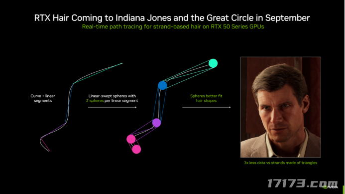这项技术基于线性扫描球体的实时路径追踪,不仅能实现更为逼真细腻的头发效果,同时还将所需数据量减少到了传统方法的1/3,可谓是加量还减价了。
