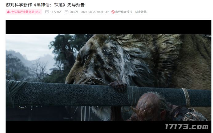 不到24小时,《黑神话:钟馗》的先导预告在B站播放量突破1172万,强势登顶全站热门榜首。