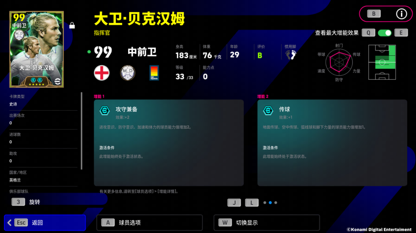 贝克汉姆增能属性为【攻守兼备 +2】,防守和进攻意识的增强让他在中场攻防一体!