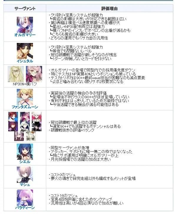 ③如今冠位战已成为日常里热度较高的关卡,因此在冠位战中表现活跃的从者会获得额外加分,不过考虑到仍有不少御主尚未能参与冠位战,所以这并非是核心的评价依据。