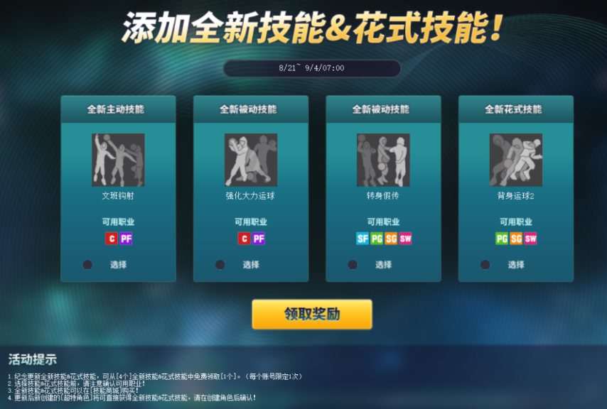 为了纪念更新全新技能&花式技能,大家可从4个全新技能&花式技能里免费领取1个,其余的全新技能&花式技能能在技能商城购买。下面让我们一同了解这4个技能~ 全新主动技能:文班钩射 全新被动技能:强化大力运球 全新被动技能:转身假传 全新花式技能:背身运球2 文班钩射可用职业:C/PF 操作方式:方向键(面向篮筐时按左或右)+连续按下两次D键。 技能效果:突破至篮下后,在防守球员难以触及的高点完成出手投篮。