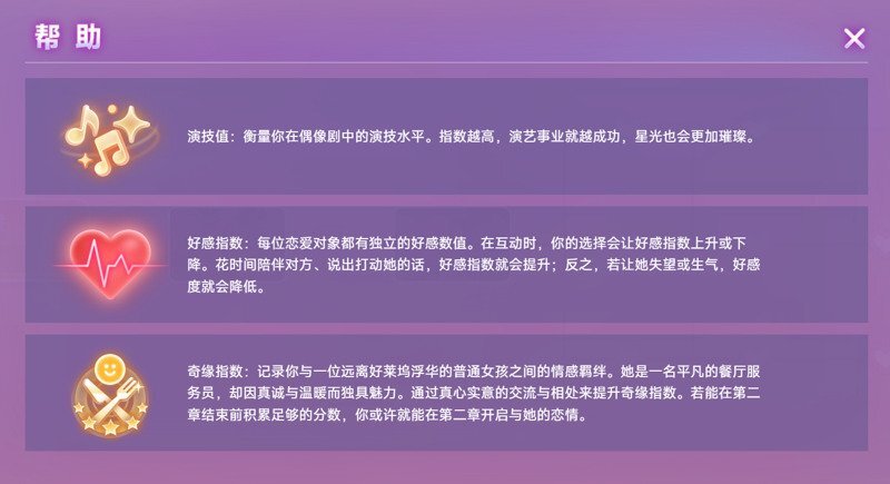 本作采用三维成长打分系统,通过演技值、好感指数与奇缘指数实时反馈玩家选择所产生的影响。