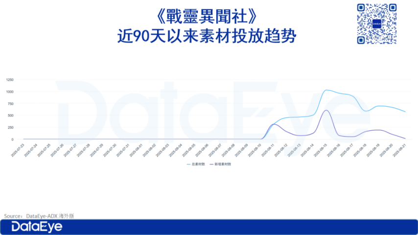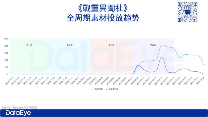 趋势分析:投放素材数与投放新素材数均为0,说明这三周内既未开展任何广告投放活动,也没有进行预热。直到上线前一天即8月11日,投放素材数大幅增长到1292个,其中新素材数达881个,占投放素材总数的68.19%。由此可见,第4周广告投放活动正式启动,且大量采用了新的广告素材。