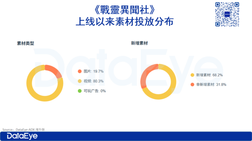 类型分布情况显示,素材类型里视频占比最高,达到80.26%,图片素材占19.74%,可玩广告的占比则是0%。由此可见,视频素材在广告投放中处于主导地位。