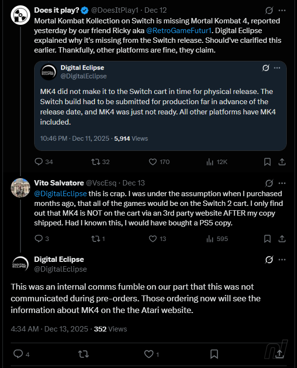 Digital Eclipse也证实该情况仅对任天堂版本造成影响。PlayStation 5实体版的光盘里收录了合集中的全部游戏。官方称要是后续Switch平台对卡带进行重印,新版本会包含《真人快打4》。