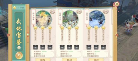 武林宝鉴共有二十七个章节,这些章节的五星总数为八十一颗。每个章节都设有建议战斗力,例如:降龙神掌的建议战斗力是30000,丐帮大会的建议战斗力35000,雪顶论争的建议战斗力40000等等,按照这个规律,最好是达到建议战斗力后再去挑战。不过如果你的小队中有高输出的高手,就无需担心这一点。但小队里必须配备治疗和控制型角色,最好再加上一个免控角色,剩下的位置留给高输出角色即可。
