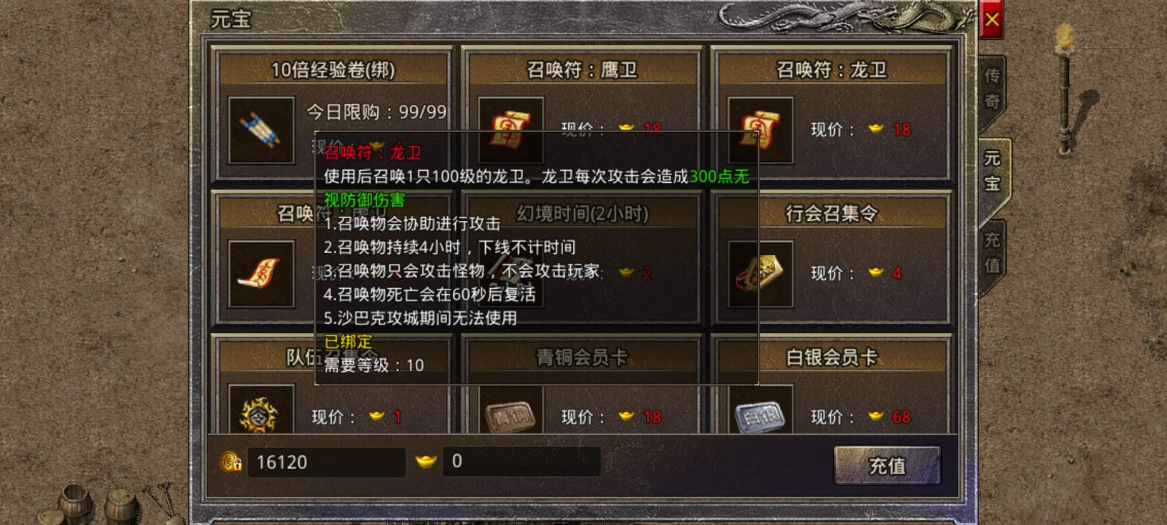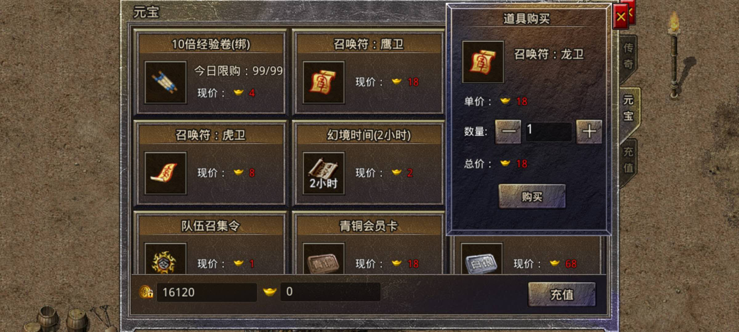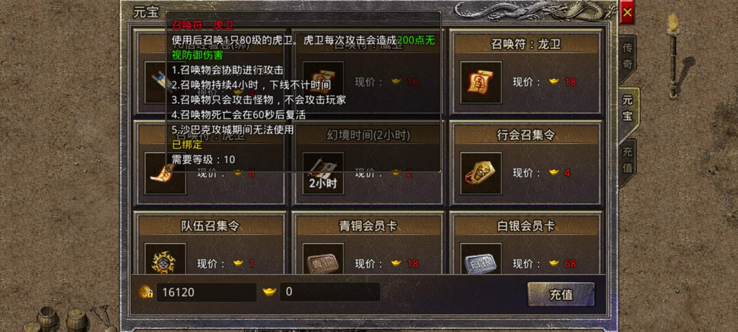 由于召唤符属于消耗类道具,为了满足练级过程中的持续需求,稳定的获取渠道就显得尤为重要。商城是直接购买召唤符的途径之一,其中巨型多角虫召唤符可使用传奇币兑换,每张需要100点传奇币;而虎卫和龙卫的召唤符则需在元宝商店购买,虎卫召唤符售价8点元宝,龙卫召唤符为18点元宝,这两种的价格相对较高。